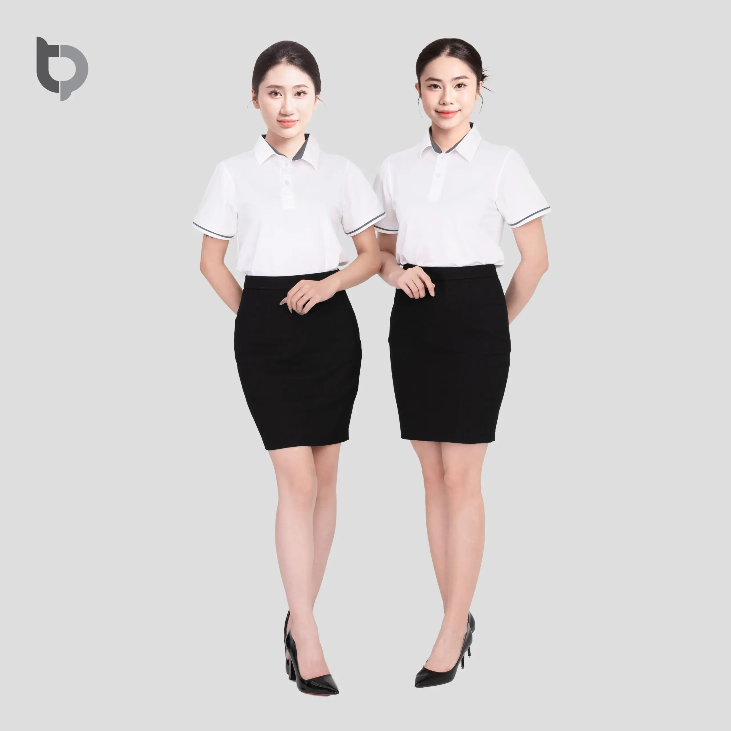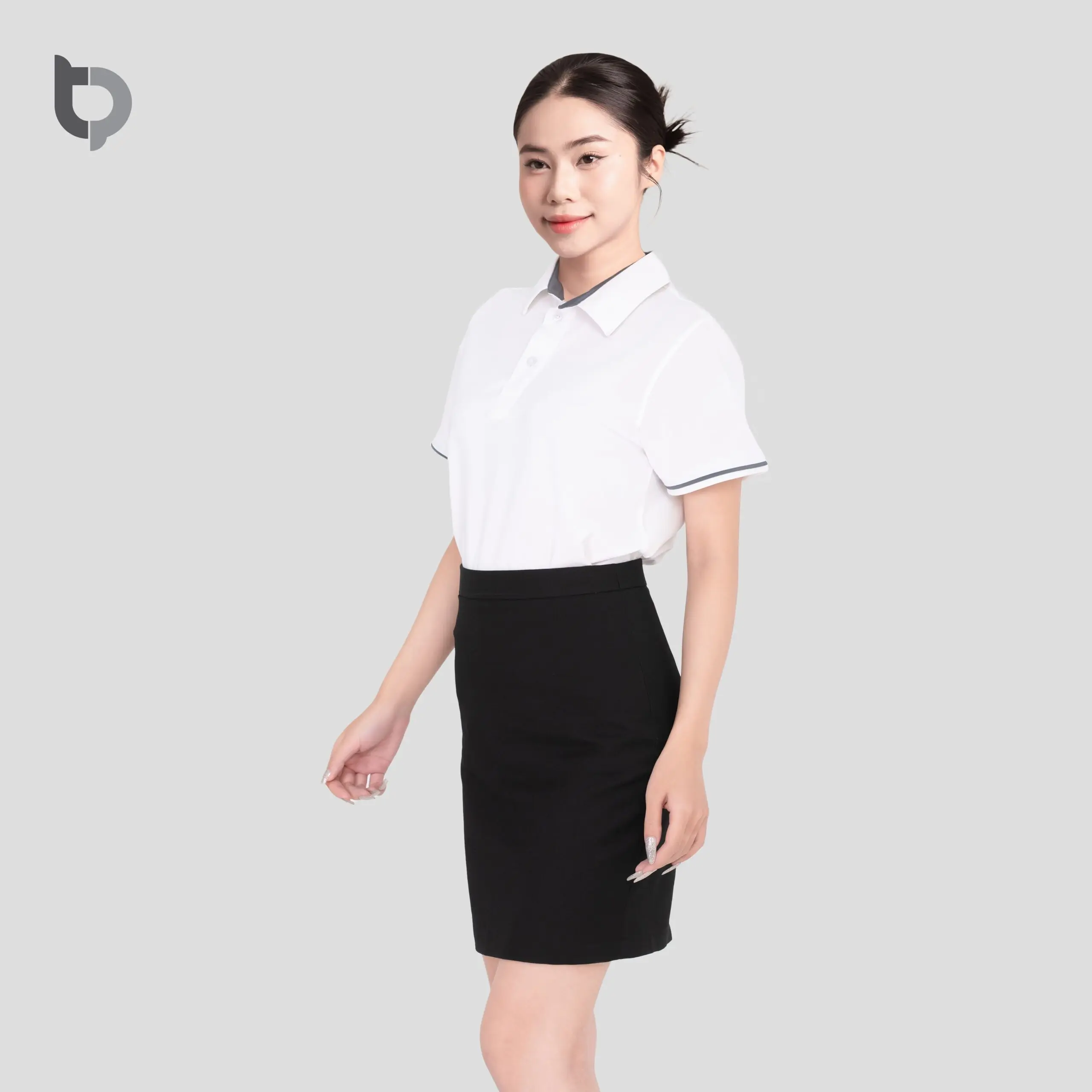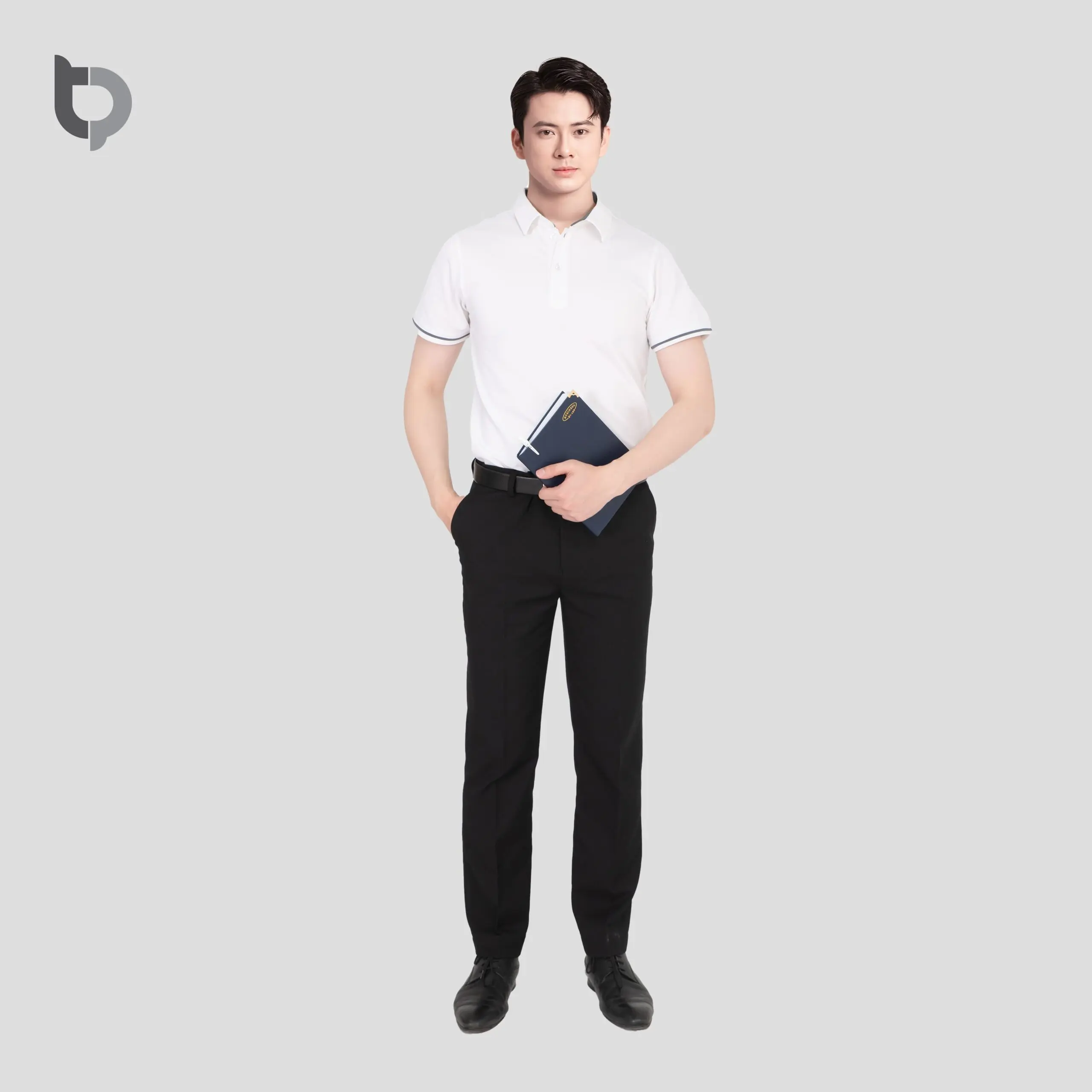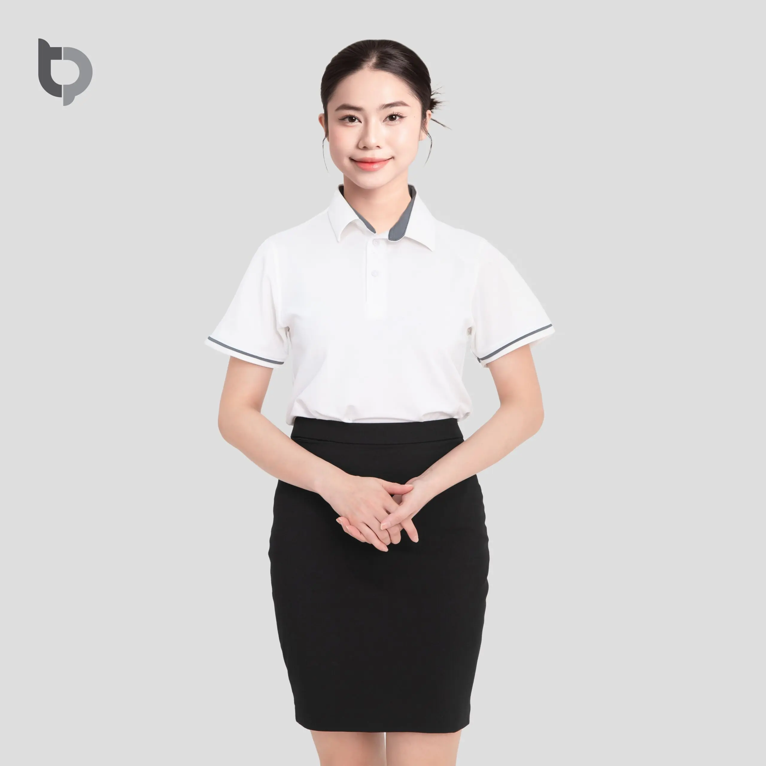 Form dáng và thiết kế: Form áo thun đồng phục BTP 08 trắng hiện đại – ôm nhẹ phần vai và tay, thân suông vừa vặn tạo cảm giác chuyên nghiệp, lịch sự. Cổ áo đứng phom, bo tay dệt cao cấp, đường may tỉ mỉ, tinh tế. Có thể phối viền cổ – tay hoặc thêu logo theo nhận diện thương hiệu.