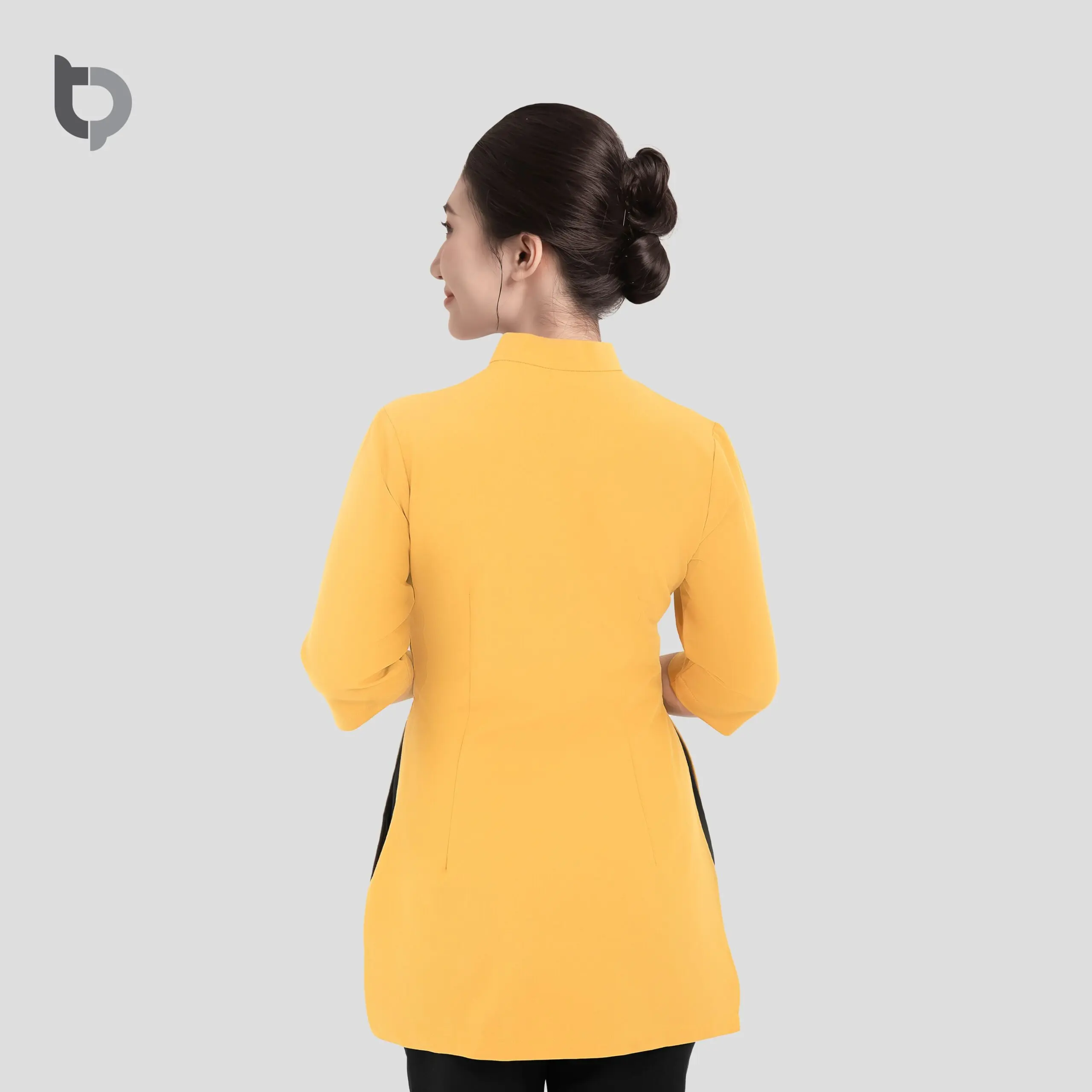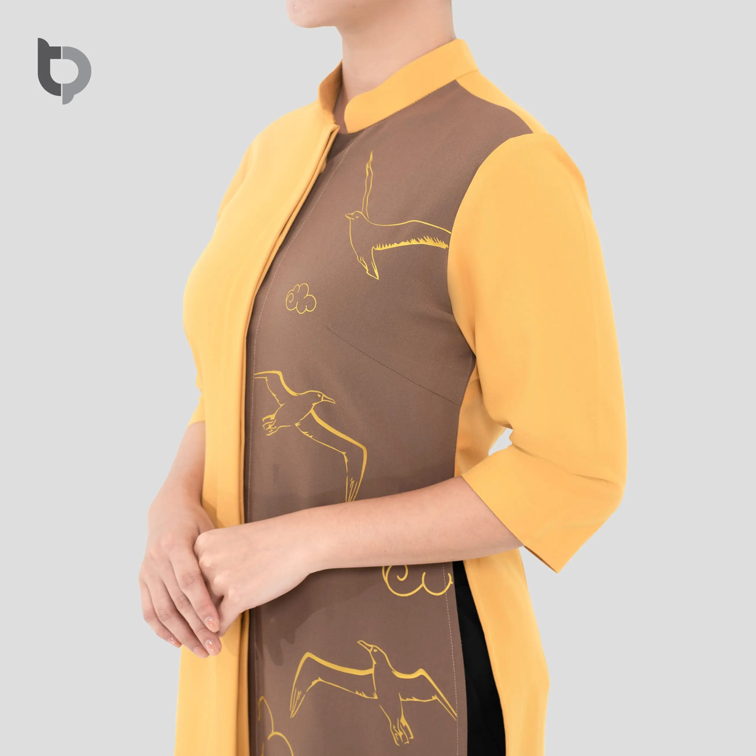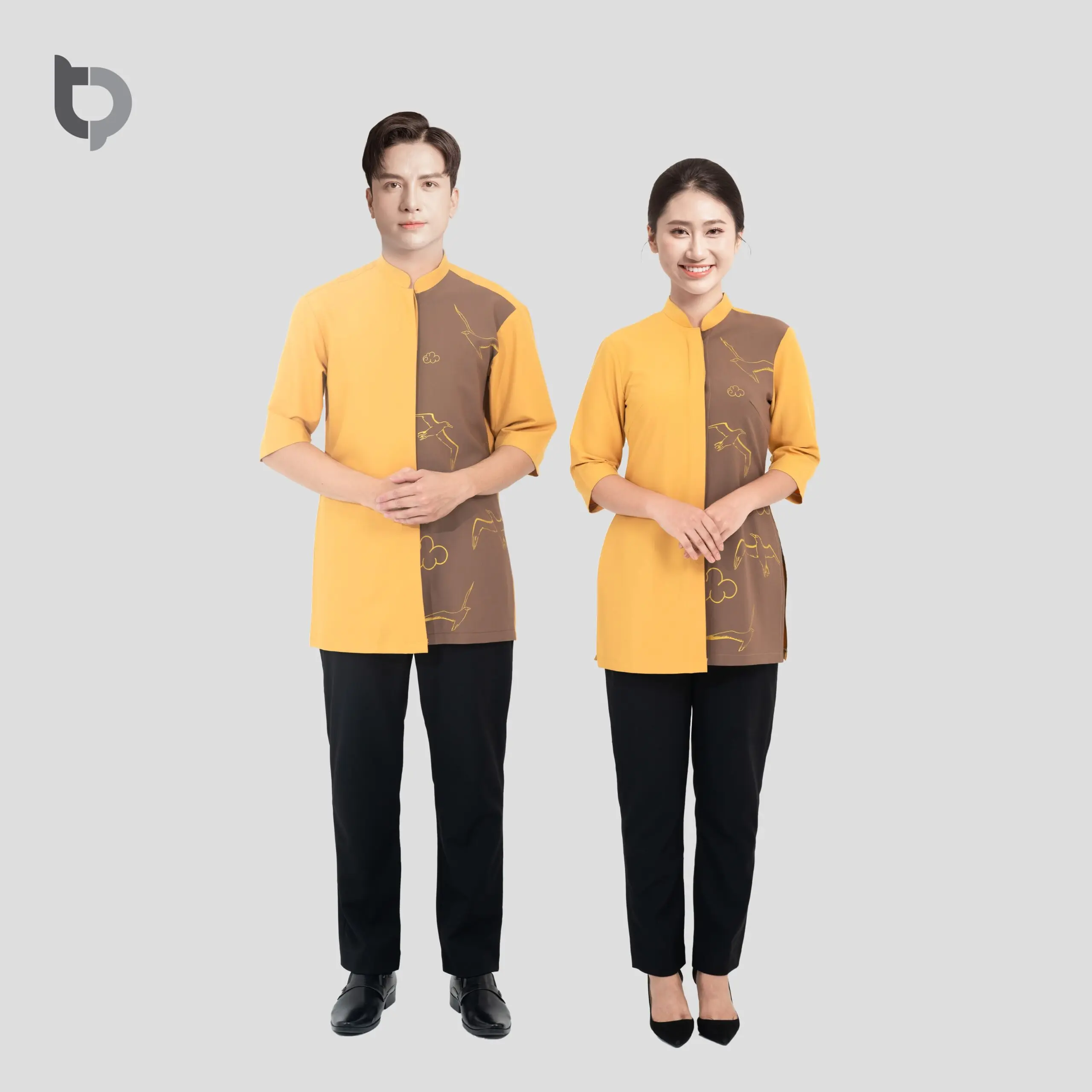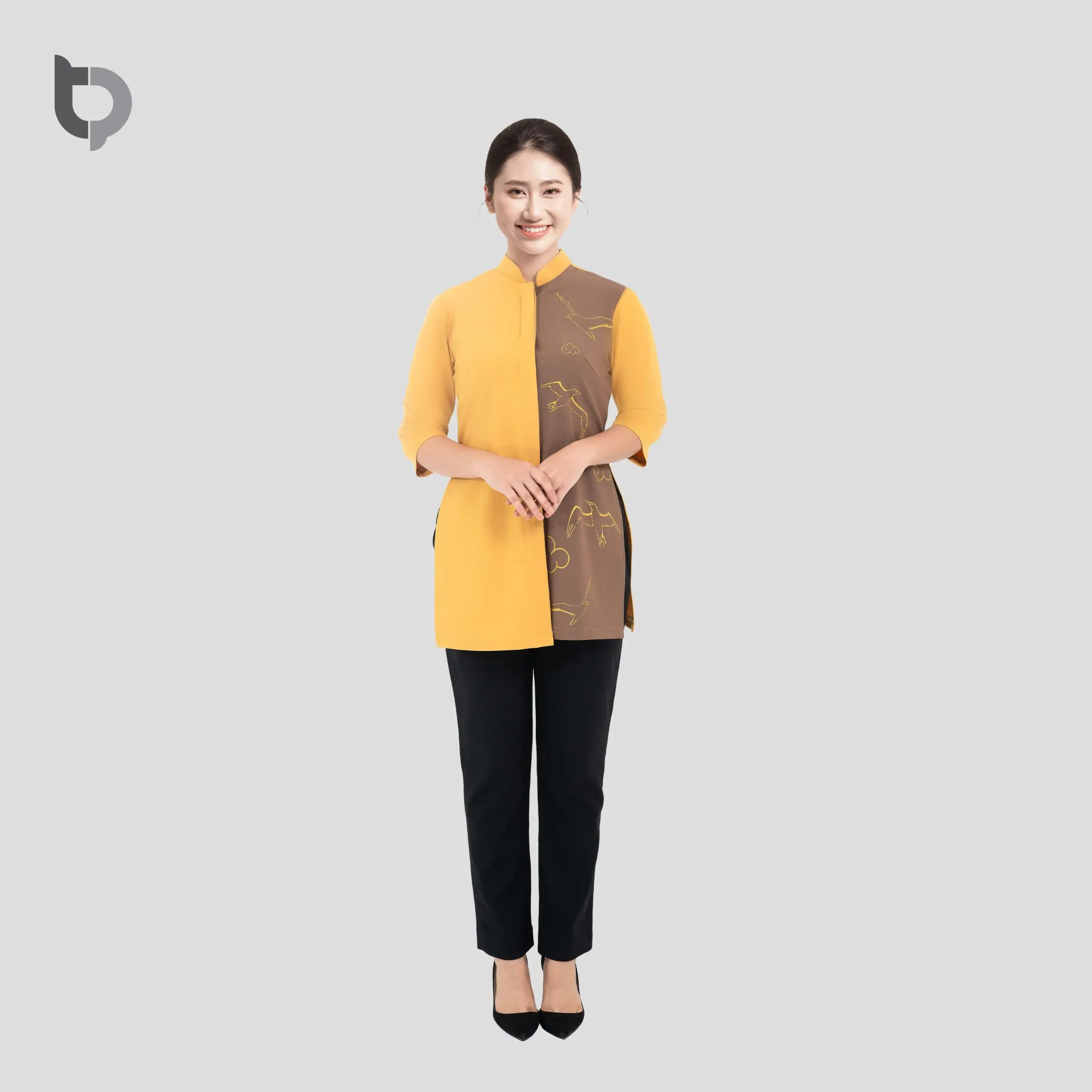 Mô tả: Mẫu đồng phục lễ tân nhà hàng BTP 02 phối hoa văn chim tay màng vàng in 3D là sự kết hợp giữa vẻ truyền thống và nét hiện đại, mang đến sự sang trọng và chuyên nghiệp cho đội ngũ nhân viên nhà hàng.