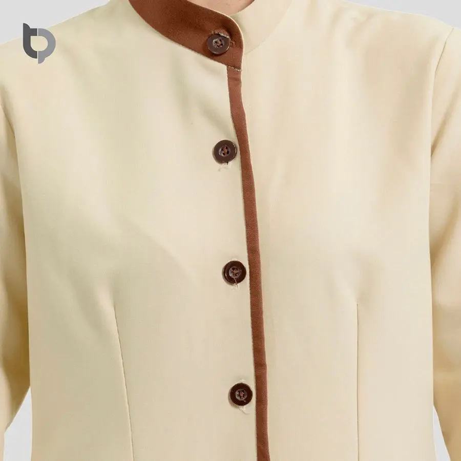 • Áo cổ tim hoặc cổ trụ, tay ngắn hoặc lửng – tùy theo quy chuẩn thương hiệu