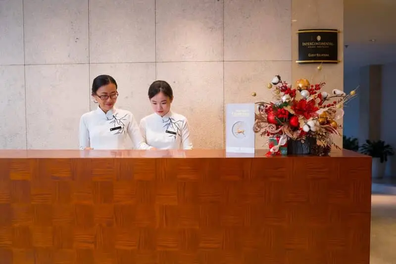 Đồng phục áo dài lễ tân khách sạn màu đỏ kết hợp với viền đen đã trở thành trang phục phổ biến cho nhân viên lễ tân. Vì nhân viên lễ tân thường mặc áo dài suốt cả ngày trong quá trình làm việc, nên áo dài cần đảm bảo sự thoải mái, co giãn và khả năng thấm hút mồ hôi tốt. Màu đỏ tạo sự nổi bật và tự tin cho nhân viên lễ tân khi tiếp đón khách hàng.