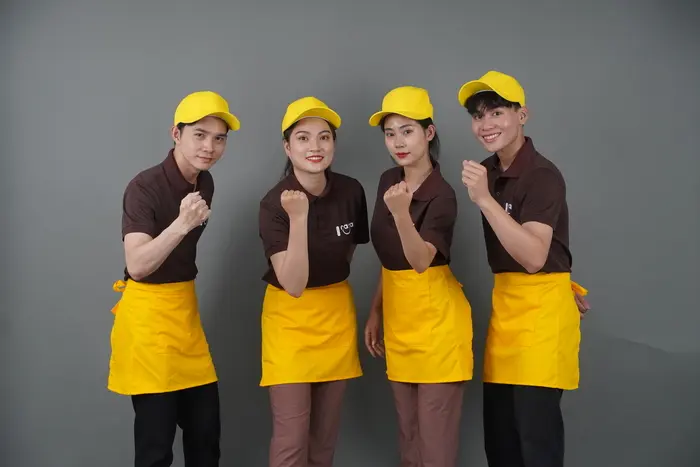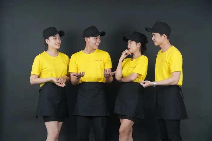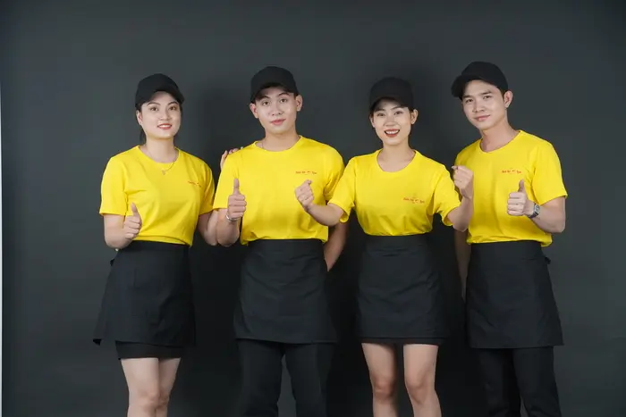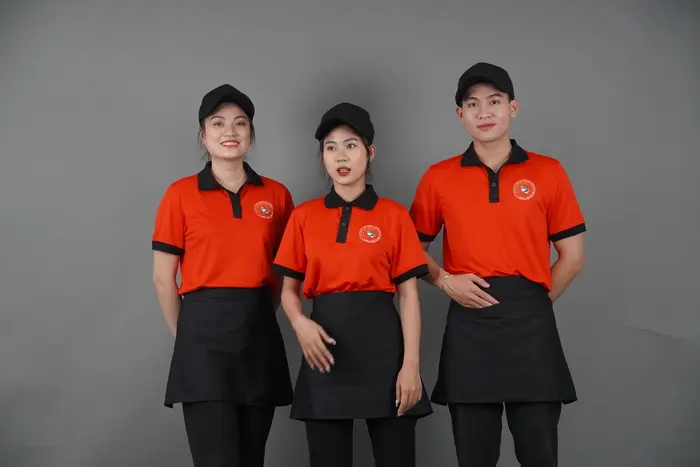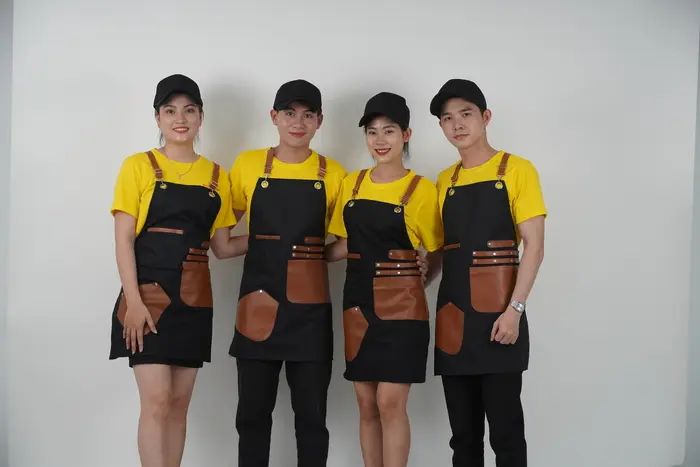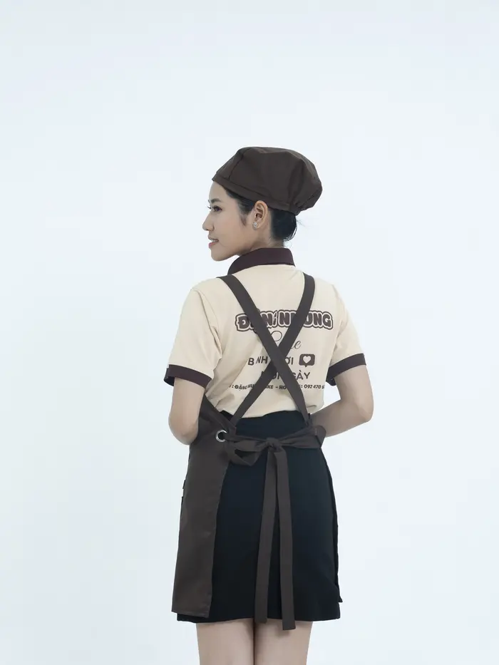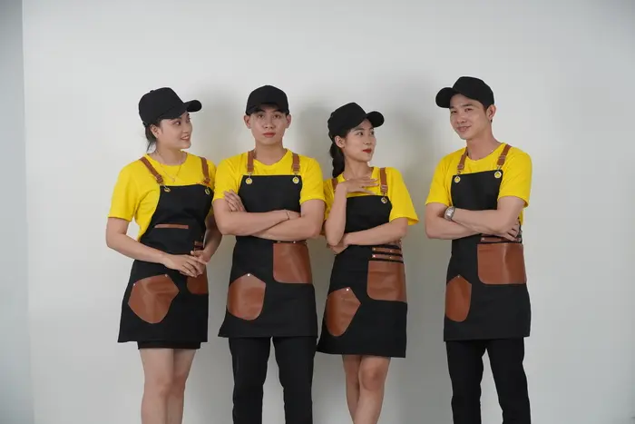 Áo đồng phục quán cafe đẹp cho nhân viên phục vụ thường là áo thun, áo sơ mi hoặc áo Polo kết hợp với các loại chân váy, quần tây. Bên cạnh đó, bạn cũng có thể chọn lựa thêm phụ kiện cho đồng phục thêm chuyên nghiệp, gọn gàng như tạp dề dạng ngắn để đựng bút, sổ order hoặc nón vải nếu nhân viên phải phục vụ ngoài trời.