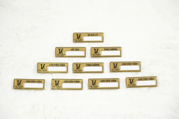Những chiếc bảng tên làm từ kim loại thường gây ấn tượng bởi bề ngoài bền bỉ, sang trọng,… Do đó, nó được ứng dụng nhiều ở môi trường ngân hàng, khách sạn,… cao cấp. Kim loại được sử dụng có thể là inox, đồng hay hợp kim nhôm,… ngoài ra còn có thể phủ thêm lớp bạc, sơn tĩnh điện hay mạ vàng. Để theo thời gian không bị phai màu, thông tin và logo doanh nghiệp thường sẽ được khắc laser.