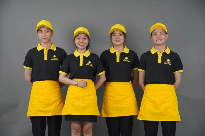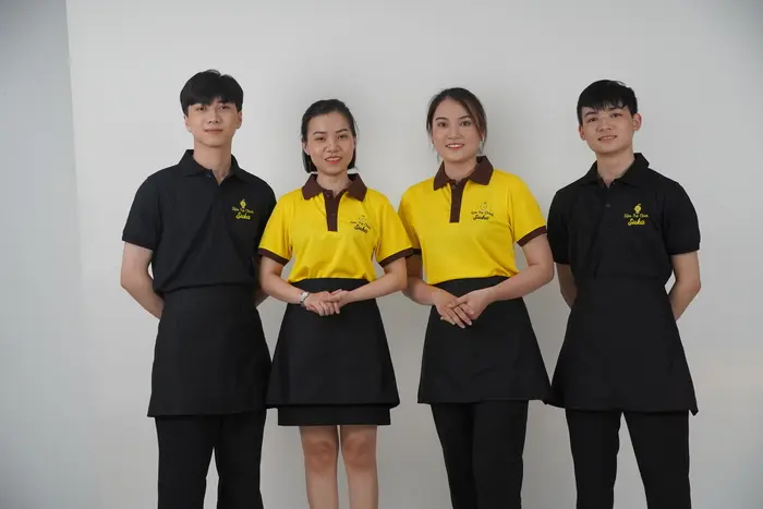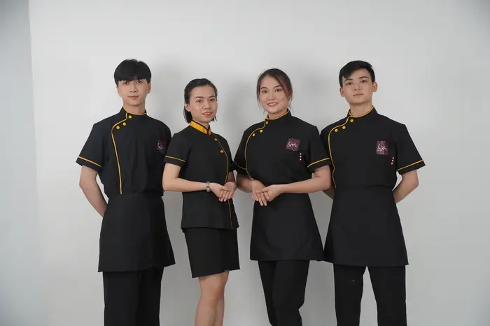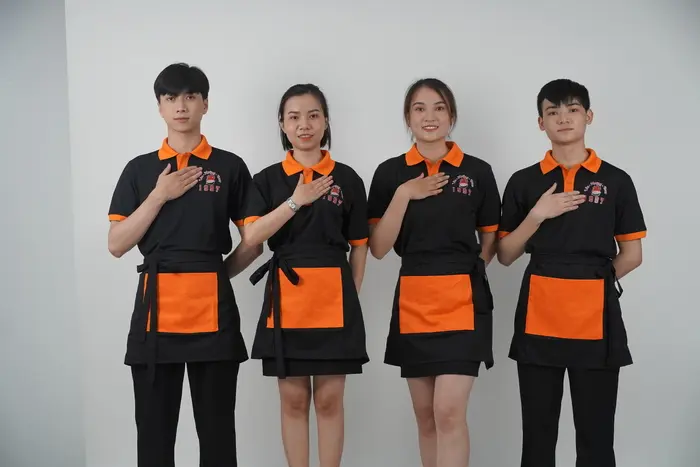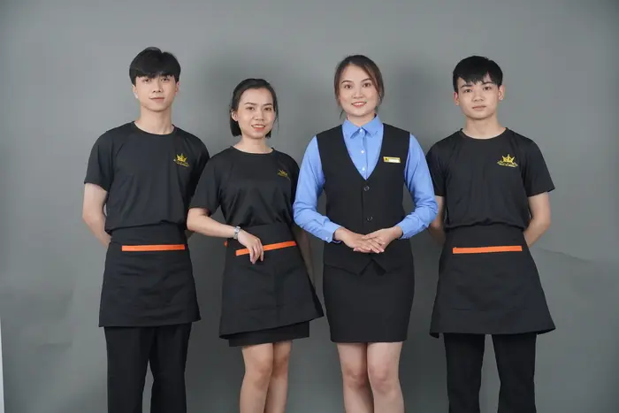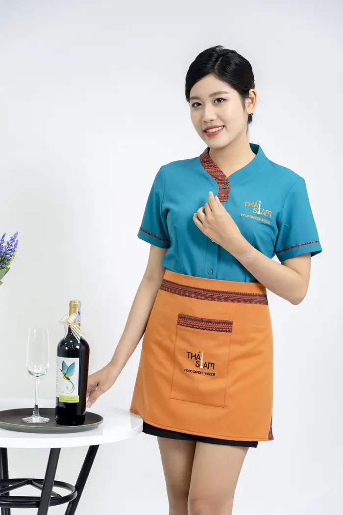 Nhà hàng, khách sạn thường lựa chọn thiết kế tạp dề đồng phục đa dạng hơn, dài hoặc ngắn tùy vào từng bộ phận. Song, điểm chung là chất liệu luôn phải thoáng mát, bền đẹp và cho cảm giác dễ chịu khi mặc. Phía trước thường bố trí túi lớn để đựng các dụng cụ cần thiết cho công việc như khăn lau, bút, sổ tay,… Màu sắc trung tính như trắng, đen kết hợp với logo doanh nghiệp được in/thêu sắc nét, bắt mắt.