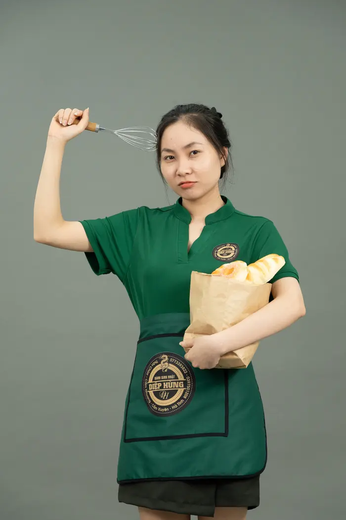 Tạp dề dạng yếm là thiết kế được bắt gặp nhiều nhất hiện nay khi có xuất xứ từ Pháp. Nó được nhận biết thông qua phần dây buộc sau cổ và ngang lưng. Ngoài che chắn vết bẩn, tạp dề yếm còn giúp đội ngũ nhân viên trở nên chuyên nghiệp hơn. Họa tiết logo in thêm giúp tạo thiện cảm với khách hàng và dễ dàng ghi nhớ thương hiệu.